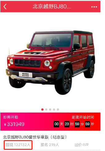 一個月后,閱兵車限量民用版——BJ80盛世華章版(紀(jì)念型)開啟公益競價,上線不到一周時間,引發(fā)超過10萬人圍觀參與!