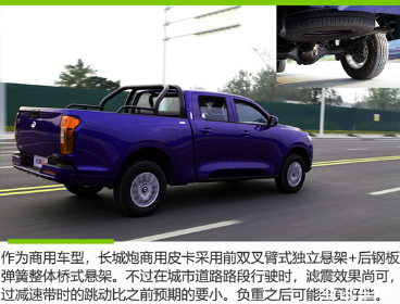 在乘用版車型上,長(zhǎng)城炮的后懸架為多連桿式獨(dú)立懸架,而到了長(zhǎng)城炮商用皮卡這里便毫無意外的換成了鋼板彈簧整體橋式懸架。長(zhǎng)城炮商用皮卡并沒忘了自己要拉貨的使命。值得一提的是,彈跳和顛簸,并沒有想象中的大,在經(jīng)過城市道路的顛簸路段時(shí),震動(dòng)能夠被有效的緩解。除此之外,長(zhǎng)城炮商用皮卡車內(nèi)NVH的控制也還算OK,80km/h行駛時(shí)并沒有產(chǎn)生令人煩躁的噪音。