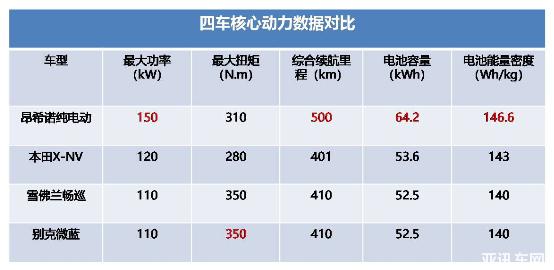 純電動車續(xù)航里的長短程直接決定用戶的日常出行半徑和駕乘體驗。四款產(chǎn)品中,本田X-NV綜合工況續(xù)航里程401Km,雪佛蘭暢巡、別克微藍NEDC綜合工況續(xù)航里程均為410Km,都邁入了400km續(xù)航門檻。