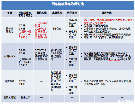 目前來看,4款車型中除雪佛蘭暢巡未上市外,其他三款車型均已上市,補貼后售價分別為昂希諾純電動17.28-19.88萬元、本田X-NV 16.98-17.98萬元 別克微藍17.78-19.98萬元,三款車型售價區(qū)間接近,接下來我們從購車政策上進行分析。