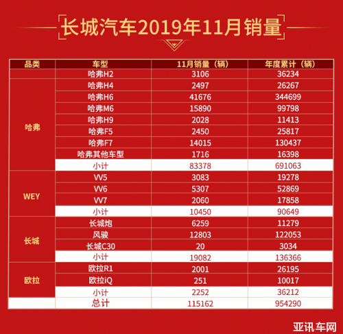 近日,長城汽車公布了2019年11月的銷量數(shù)據(jù),旗下四大品牌共銷售新車115162輛,在此基礎(chǔ)上,1-11月累計銷量達(dá)到954290輛,相比去年同期逆勢增長3.81%,這和國內(nèi)低迷的市場環(huán)境形成了鮮明對比,長城汽車也成為了在車市陷入低增長甚至是負(fù)增長困境下為數(shù)不多取得同比增長的汽車企業(yè)。