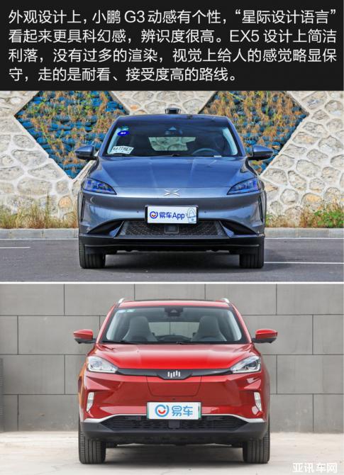 兩款車型都采用了純電動力,定位相同,同屬造車新勢力推出的緊湊級精品純電SUV,起售價也非常接近。兩車同樣支持快充和慢充兩種補能方式,但在保修政策方面,小鵬G3的4年或10萬公里政策相比EX5的3年或10萬公里略有優(yōu)勢。