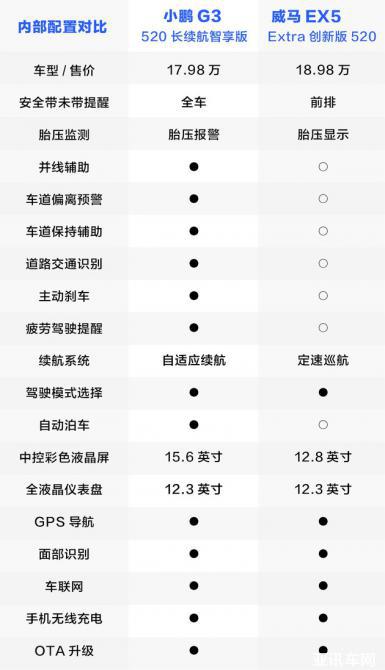 雖然目前在同價位的新能源車型有不少,但作為新興造車勢力的代表,小鵬G3最直接的競爭對手就是威馬EX5。從消費者最為關注的續(xù)航里程來看,威馬EX5提供400km和520km兩種續(xù)航里程版本,小鵬G3則是提供了401km和520km的續(xù)航版本,續(xù)航能力難分伯仲。但在內(nèi)部配置方面,小鵬G3則要豐富許多,不論是自動駕駛輔助系統(tǒng)還是舒適性配置,都遠超同等價位的威馬EX5,是更具性價比的選擇。