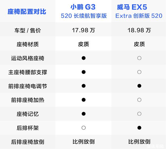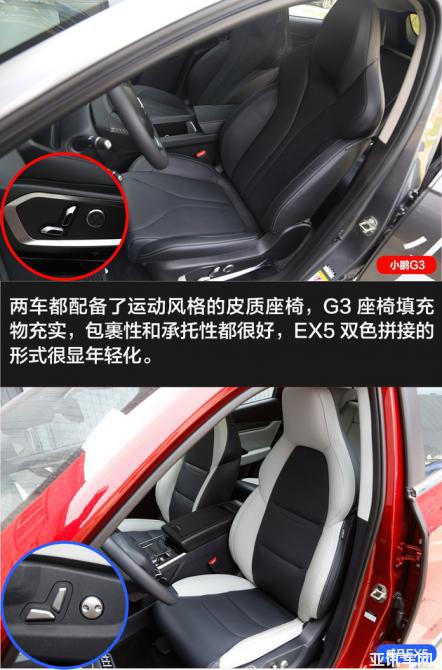 在座椅配置上,小鵬G3依舊更為全面,相比EX5多出了運動風格座椅、主座椅腰部支撐、前排座椅加熱以及座椅記憶功能。