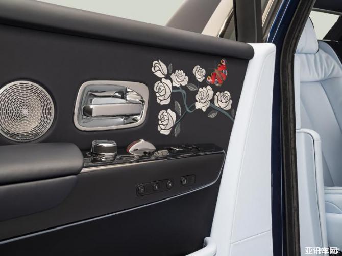 根據(jù)勞斯萊斯發(fā)布的官圖顯示,新車在中控臺、后門板以及車頂?shù)榷嗵幖尤肓嗣倒寤ㄖ黝}的刺繡,官方宣稱這些刺繡由超過100萬細(xì)密針腳組成,凸顯了勞斯萊斯獨特的定制工藝。而新車的設(shè)計靈感則來源于勞斯萊斯古德伍德總部的玫瑰花圃,這里培育著獨一無二的幻影玫瑰。同時,新車的座椅和部分中控臺由查爾斯藍(lán)色真皮包覆,其余部分則采用黑色設(shè)計,顯得十分雅致。