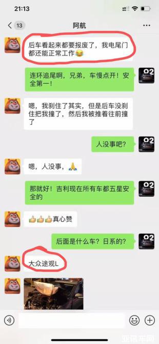 12月9日,在G92杭州灣環(huán)線高速公路上發(fā)生了一起三車連環(huán)追尾:一輛博越PRO被大眾途觀L和邁銳寶前后夾擊:大眾途觀L以較高車速撞上了前車博越PRO,在慣性作用下,博越PRO又撞上了前面的邁銳寶。結(jié)果后面的途觀L基本報(bào)銷,前面邁銳寶的后備箱被毀,而中間的博越PRO外觀看起來卻沒什么大事,后尾門都還能正常工作。事故發(fā)生后,所幸所有人都沒事,前后兩個(gè)車主甚至還跑去問博越PRO車主:“這車怎么這么硬?”