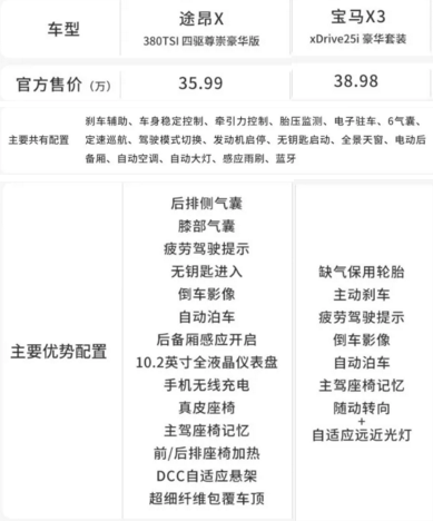 以售價(jià)相對(duì)接近的途昂X 380TSI 四驅(qū)尊崇豪華版,與寶馬x3對(duì)應(yīng)的xDrive25i豪華套裝車款來對(duì)比,途昂X在優(yōu)勢(shì)配置方面,多了DCC自適應(yīng)懸架,它能帶來更好的舒適性和操控;后排側(cè)氣囊的加入,使得途昂X全車有了9氣囊,在被動(dòng)安全防護(hù)方面做到了最好。
