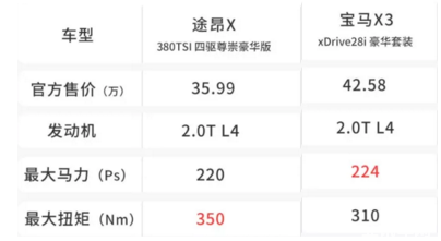 即便是與寶馬X3的中檔調(diào)校動(dòng)力相比,途昂X 380TSI車型也是不遜色的,最大馬力方面寶馬X3的28i車型只是多了4Ps,最大扭矩方面途昂X 380TSi優(yōu)勢(shì)還是非常明顯的。