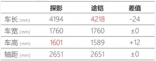 來(lái)到兩者的尺寸對(duì)比。雖然在軸距上兩者都是2651 mm,不過(guò)具體到長(zhǎng)寬高的尺寸,途鎧顯然就更有優(yōu)勢(shì)了,從兩者的數(shù)據(jù)對(duì)比中可以看到,途鎧整車長(zhǎng)度為4218mm,要超過(guò)探影24mm,看上去就要比探影大上一號(hào)。