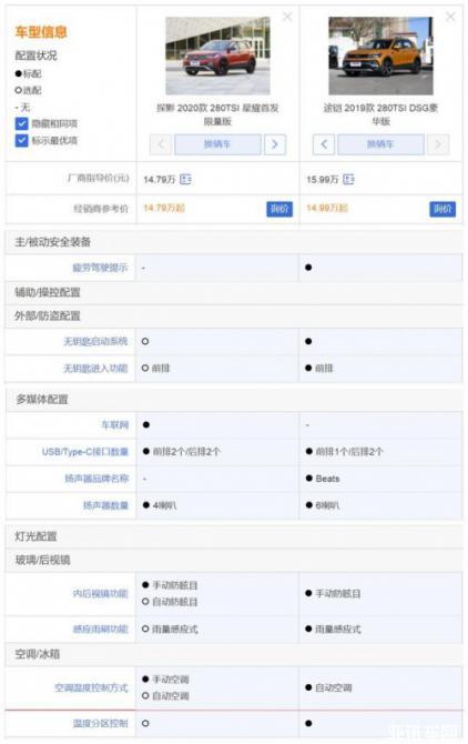 在配置與售價(jià)方面,途鎧與探影之間并無(wú)多大的差別,大家的起步配置與頂配版本都有相當(dāng)不錯(cuò)的舒適與安全配置。不過(guò)考慮到兩者的終端優(yōu)惠價(jià),情況就有些不同了。從經(jīng)銷商處得知,目前途鎧全系有近1萬(wàn)左右的讓利空間,而探影正處于上市期,短期內(nèi)售價(jià)不可能下調(diào),相比較的話,途鎧就有了更高的性價(jià)比了。比如此次探影主打的280TSI首發(fā)限量版售價(jià)為14.79萬(wàn),而途鎧頂配280TSI豪華版在優(yōu)惠后的售價(jià)也只要14.99萬(wàn),對(duì)比兩款車型的配置,途鎧幾乎是全面領(lǐng)先的,尤其是像無(wú)鑰匙啟動(dòng)與進(jìn)入、自動(dòng)空調(diào)等探影需要花錢選配的配置,在途鎧上都是標(biāo)配,這里的差別也是比較大的。