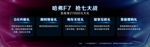 “0元升艙禮”,二手車(chē)置換哈弗F7,二手車(chē)款抵新車(chē)首付款,消費(fèi)者可勁享至高6000元置換補(bǔ)貼,以及9000元金融貼息的雙重優(yōu)惠,輕松享受0元升艙;