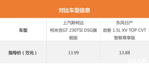 這次比較,我們選擇了價格接近的車型,分別是上汽斯柯達(dá)柯米克GT 230TSI DSG旗艦版(以下簡稱柯米克GT)和東風(fēng)日產(chǎn)勁客1.5L XV TOP CVT智聯(lián)尊享版(以下簡稱勁客)。