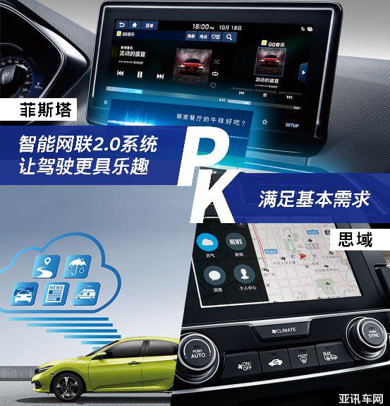 菲斯塔中控臺(tái)上的10.25英寸屏幕是內(nèi)部空間中最顯眼的部分,其搭載百度智能網(wǎng)聯(lián)2.0系統(tǒng),可以實(shí)現(xiàn)對(duì)車輛的遠(yuǎn)距離控制。而思域的多媒體系統(tǒng)略顯單調(diào),中央屏幕僅有7英寸,搭載了Honda CONNECT系統(tǒng),雖然相比本田上一代使用的DA系統(tǒng)有很大提升,但若單論車載系統(tǒng)的可玩度,菲斯塔還是占據(jù)一定優(yōu)勢(shì)的。