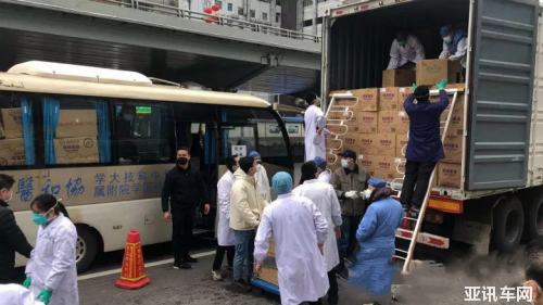 (運(yùn)送物資的商用車抵達(dá)武漢,醫(yī)生與工作人員卸貨)