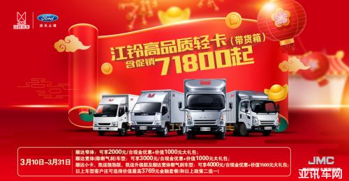 3月萬物復(fù)蘇,春意無邊。隨著疫情不斷好轉(zhuǎn),好消息源源不斷從前線傳來,大家笑容逐漸多了起來,也都開始進(jìn)入緊鑼密鼓的工作當(dāng)中。對于物流人來說,在新的一年,選一輛高品質(zhì)的輕卡是首要任務(wù)。在物流車中,JMC這個江鈴標(biāo)致的輕卡的出鏡率是極高的,這也從側(cè)面說明了江鈴車的品質(zhì)。目前江鈴輕卡為回饋廣大消費(fèi)者,從3月10日起,江鈴輕卡優(yōu)惠享不停,等你來挑選。