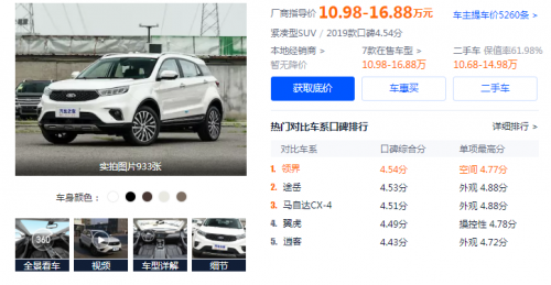SUV是目前最受歡迎的家用車型之一,國內(nèi)消費者對于高品質(zhì)SUV的需求也是日益旺盛,其中又以合資緊湊型SUV這一細分車型最為熱銷,目前市場上能夠見到的不同品牌合資緊湊型SUV車型少說也有上百種,難免會讓我們在購車時不知所措挑花了眼。大部分人在這個時候通常會求助于專業(yè)汽車網(wǎng)站,從眾多已購車用戶的真實口碑中借鑒參考,可以從下圖看出,在緊湊型SUV這一細分市場,福特領(lǐng)界力壓眾多主流車型,憑借大空間、高智能、高安全等優(yōu)勢獲用戶一致好評。