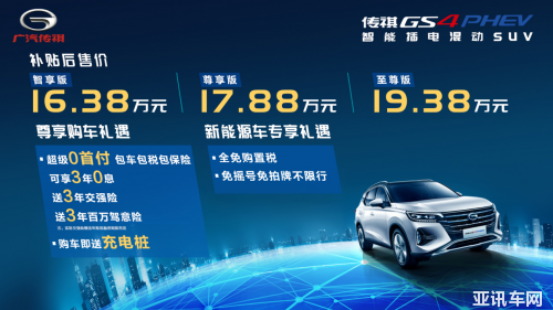 傳祺GS4 PHEV補貼后售價為16.38-19.38萬元,并同時享有超值購車禮遇:超級0首付,包車包稅包保險;享3年0息;送3年交強險、百萬駕意險;同時購車即送充電樁。其次還能擁有新能源車專享:全免購置稅,免搖號免拍牌不限行。如此好車+好價,不心動都難!