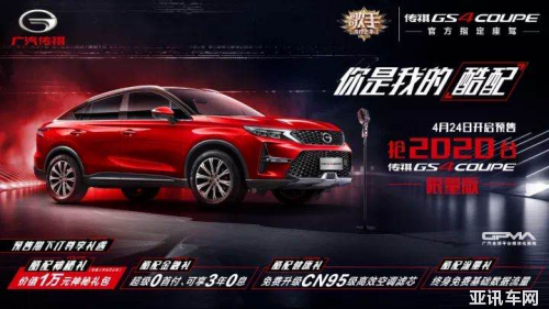 將于5月上市的GS4 COUPE已經(jīng)揭開了神秘的面紗,在《歌手·當打之年》決賽中作為“星”座駕驚艷亮相,并在4月24開啟預售,推出2020輛限量款,吸粉無數(shù)。在預售期間下訂的消費者,即可享受價值1萬元神秘禮包、超級0首付,3年0息、免費升級CN95級高效空調(diào)濾芯、終身免費基礎(chǔ)數(shù)據(jù)流量等多重好禮。