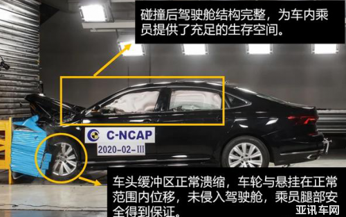 在最關(guān)鍵的乘員保護(hù)方面,上汽大眾帕薩特得到了66.400分,其得分率為94.86%。其中,在正面100%重疊剛性壁障碰撞測試中,上汽大眾帕薩特的表現(xiàn)還算不錯。車輛以50km/h的時速與剛性壁障發(fā)生碰撞,碰撞發(fā)生后,車架縱梁等車體主體結(jié)構(gòu)件完好,車體前部的吸能盒及發(fā)動機(jī)艙充分潰縮吸能,發(fā)動機(jī)主動下沉,機(jī)艙內(nèi)的零部件及車輛的轉(zhuǎn)向機(jī)構(gòu)并未突破防火墻侵入到乘客艙內(nèi),整個乘客艙完整度較高,并未發(fā)生明顯的變形,車門也可以正常的打開。
