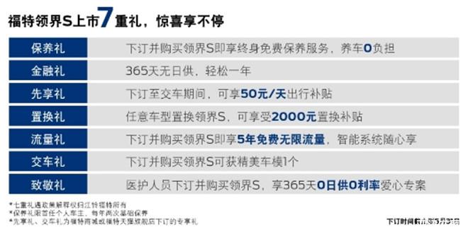 領(lǐng)界S作為一款緊湊SUV,智能、空間、安全優(yōu)勢(shì)明顯,符合時(shí)下消費(fèi)者對(duì)于汽車的需求。為了更好的回饋消費(fèi)者,即日起蒞臨展廳下單福特領(lǐng)界S,即可享受七重禮遇不僅立享終身免費(fèi)保養(yǎng)服務(wù)、還有365天無日供、2000元置換補(bǔ)貼、下訂到交車50元日補(bǔ)貼、5年免費(fèi)無限流量、領(lǐng)界S車模1套、醫(yī)護(hù)人員365天0日供0利率購車專享多項(xiàng)政策,從下單到提車,每一步都能享受超凡禮遇政策。(詳情請(qǐng)咨詢經(jīng)銷商)