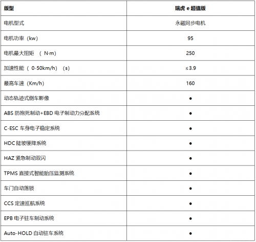 在動(dòng)力方面,瑞虎 e超值版搭載永磁同步電機(jī),最大功率達(dá)95kw,最大扭矩為250 N·m,0~50km/h加速僅3.9秒,超強(qiáng)動(dòng)力讓駕馭更激情。而諸如倒車影像、自動(dòng)駐車等智能駕駛輔助配置讓行駛過(guò)程更加簡(jiǎn)單便捷,提升駕駛舒適度。