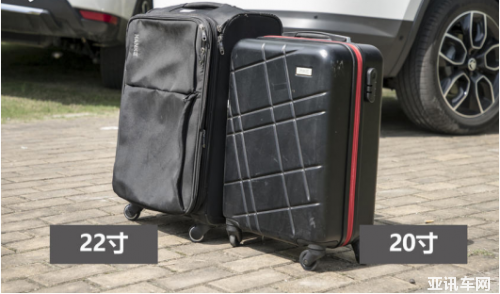 為了帶給大家更為直觀的行李廂空間展示,我們找來了兩個(gè)旅行箱作為測試道具,左側(cè)旅行箱大小22寸,右側(cè)旅行箱為20寸。兩車行李廂空間測試,馬上開始。