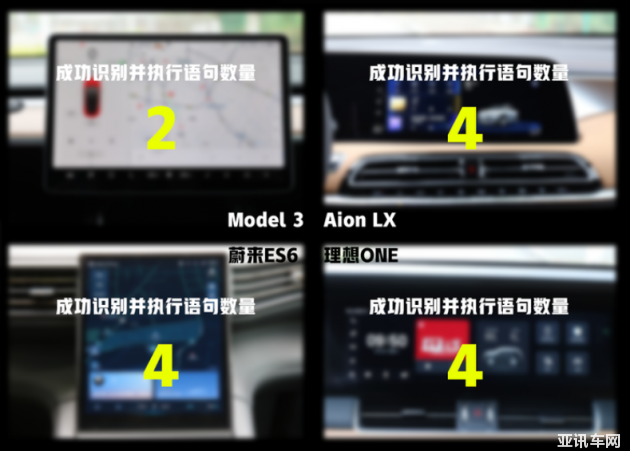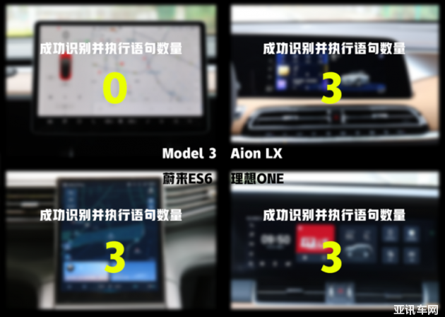 語音測試的首個(gè)環(huán)節(jié),對4臺車的語音系統(tǒng)進(jìn)行常規(guī)功能支持測試。從測試結(jié)果看,蔚來ES6、理想ONE以及Aion LX都能準(zhǔn)確地識別簡單的語音指令,但特斯拉Model 3則不能順利完成其中兩條指令的識別以及執(zhí)行。其中“空調(diào)調(diào)至25攝氏度”,Model 3能識別,但空調(diào)溫度沒有發(fā)生變化,需要把指令改成“溫度調(diào)至25攝氏度”才能執(zhí)行。