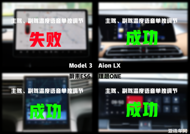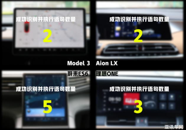 蔚來ES6綜合表現(xiàn)最好,能準(zhǔn)確識別5條測試指令并執(zhí)行對應(yīng)動作,接著就是理想ONE完成3條指令。Model 3和Aion LX表現(xiàn)都不太理想。另外,還測試了4臺車能不能識別車內(nèi)不同乘客發(fā)出的語音指令。主駕駛說“我很熱”、副駕駛位說“我很冷”。從測試結(jié)果來看,僅Model 3失敗,其余3款車都能準(zhǔn)確識別并分別調(diào)節(jié)主駕、副駕溫度。