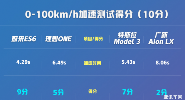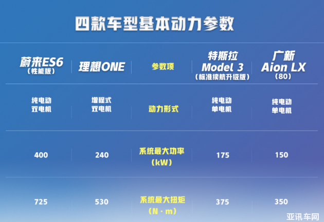 性能測試從加速、制動、麋鹿測試、繞樁以及噪音五個(gè)維度展開。在測試開始前,先來看看4款車的動力參數(shù)。蔚來ES6性能版售價(jià)最高,所以在動力水平上也毫無懸念的遠(yuǎn)超另外三款車型。Model 3和Aion LX由于都是單電機(jī),在參數(shù)方面就顯得有些寒酸了。