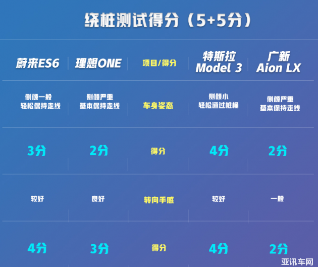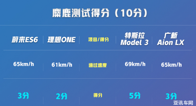 麋鹿測試需要不斷增加速度重復(fù)測試,直至得出通過的極限速度。蔚來ES6是四臺車當(dāng)中測試次數(shù)最少的,主要是車與人之間的溝通很清晰,很容易就能捉摸車身的意圖。另外電子系統(tǒng)的介入也比較積極。理想ONE過于龐大的車身,和偏高的重心讓其成績不盡人意。Model 3轎車的低重心物理優(yōu)勢在麋鹿測試中得到了很好的體現(xiàn),成績也與同場車型拉開差距。Aion LX的底盤調(diào)校與電子系統(tǒng)讓其同樣獲得了一個(gè)不錯(cuò)的成績。