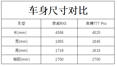 從下圖可以看出來,榮威RX5的車身長度、寬度和奔騰T77 Pro的幾乎相差無幾,相同的軸距長度意味著兩車的內(nèi)部空間基本上也沒有差別。唯一有些區(qū)別的就是兩車的高度,奔騰T77 Pro在不影響乘坐體驗(yàn)的情況下降低了車身的高度,可以有效地減小風(fēng)阻,并且可以使奔騰T77 Pro在視覺上更具有運(yùn)動(dòng)感。