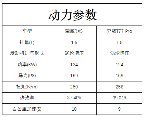 榮威RX5和奔騰T77 Pro的發(fā)動(dòng)機(jī)具體參數(shù)見下圖。從圖中可以看出,奔騰T77 Pro所使用的發(fā)動(dòng)機(jī)在扭矩、熱效率、百公里加速上都是要優(yōu)于榮威RX5的。