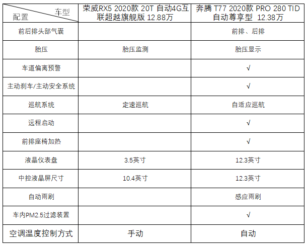 從上圖中可以看出來,盡管有著5000元的差價(jià),奔騰T77 Pro的配置還是要比榮威RX5豐富一些,其中不乏一些很重要的安全配置,比如說主動(dòng)剎車系統(tǒng)和車道偏離預(yù)警系統(tǒng)。