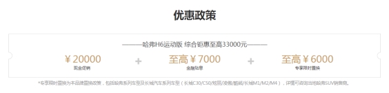 除此之外,長(zhǎng)城汽車在7月1日-7月31日開(kāi)啟了線上活動(dòng),在天貓長(zhǎng)城汽車官方旗艦店上可9.9元購(gòu)買哈弗H6運(yùn)動(dòng)版1000元下線抵扣優(yōu)惠券。絕對(duì)實(shí)惠到家,驚喜連連!