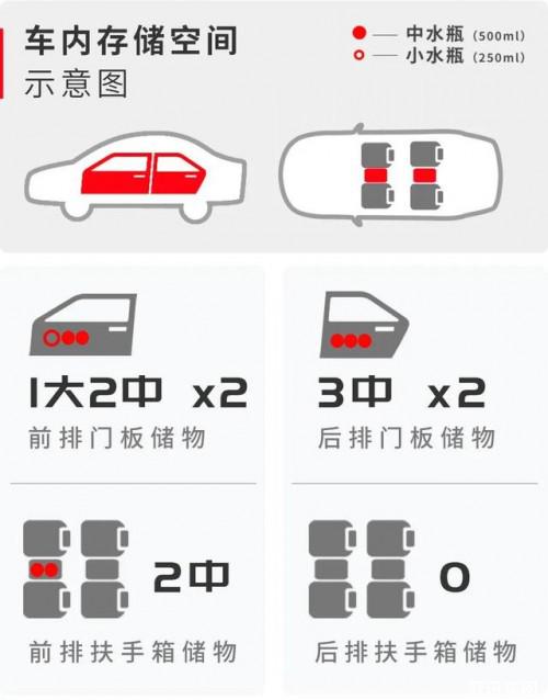 儲(chǔ)物空間方面,昕動(dòng)表現(xiàn)同樣出色。前排門(mén)板最多能放置1支大號(hào)礦泉水瓶和2支中號(hào)礦泉水瓶,中央扶手可以放下2支中號(hào)礦泉水瓶;后排兩側(cè)可分別放置3支中號(hào)礦泉水瓶,后排中間沒(méi)有水杯架。
