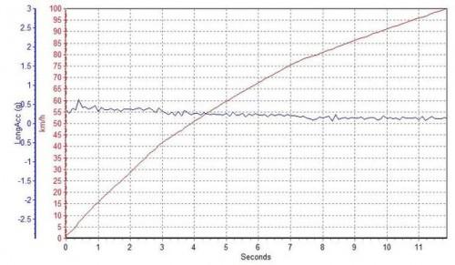 從P-box數(shù)據(jù)可以看出,昕動(dòng)的起步比較不錯(cuò),在剛起步時(shí)最大g值達(dá)到0.5g左右,有較為不錯(cuò)的提速感受,6AT變速箱在換擋平順性上也是值得肯定的。只不過(guò)受限于發(fā)動(dòng)機(jī)馬力較弱的原因,后段加速能力有所下降,最終它獲得了11.85秒的破百成績(jī)。