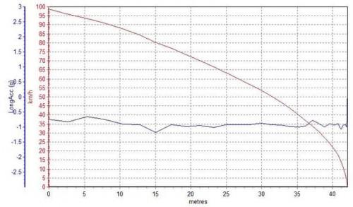 從P-box中的數(shù)據(jù)可以看到,初始-g值達(dá)到-1.2g,之后穩(wěn)定到-1 g左右,整個(gè)剎車(chē)過(guò)程比較平穩(wěn),最終它取得了43.35米剎停的成績(jī)。在遇到緊急情況時(shí),更短的剎車(chē)距離可以極大程度上避免事故發(fā)生。