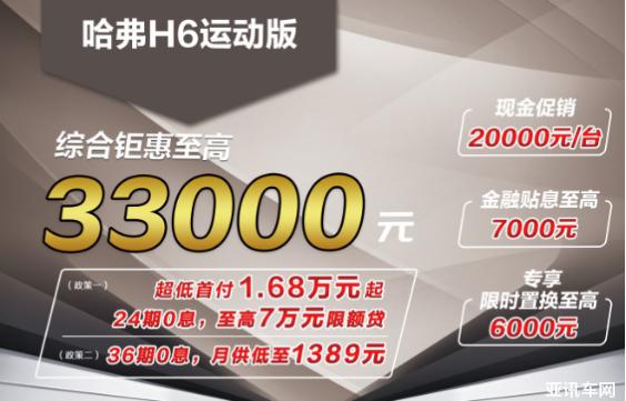 因此哈弗H6運動版目前為消費者準(zhǔn)備了至高3.3萬元鉅惠,其中包括2萬元現(xiàn)金促銷,至高7000元金融貼息和至高6000元專項置換補貼,每一項優(yōu)惠都透露著哈弗品牌回饋消費者的滿滿誠意。而且消費者可享受多種0息金融方案,例如24期0息方案,僅用1.68萬元就可以將嶄新的哈弗H6運動版帶走;36期0息方案下,換算日供僅46.3元,而這筆錢完全可以從有車后每天省下的打車費里扣除,購買哈弗H6運動版就是這么輕松愉快!