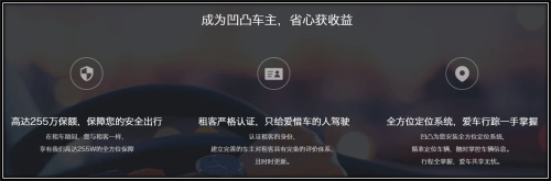【凹凸租車】獨(dú)家提供適合共享租車模式的255萬元的全新險種,這是目前行業(yè)最高保額度的全方位責(zé)任險,將車主和租客的風(fēng)險降至最低,保障出租雙方利益。
