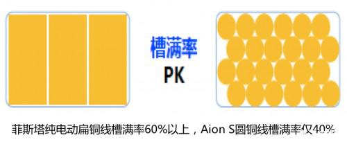 為什么存在這種情況?筆者著重從三電技術(shù)剖析。關(guān)于電驅(qū)動(dòng),兩款車雖然均采用了三合一集成式設(shè)計(jì),但菲斯塔純電動(dòng)的電驅(qū)動(dòng)重量僅76.9kg,Aion S的電驅(qū)動(dòng)重量則高達(dá)88kg。究其原因,電機(jī)繞組的形式是關(guān)鍵所在。菲斯塔純電動(dòng)的電驅(qū)動(dòng)采用扁銅線設(shè)計(jì),相比Aion S圓銅線設(shè)計(jì),重量更輕、槽滿率更高, 達(dá)到60%以上,從而以更高的功率密度和散熱性能,賦能更真實(shí)的續(xù)航表現(xiàn)。
