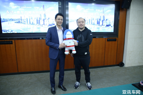 永達(dá)集團(tuán)總裁徐悅與易車CEO張序安在簽約儀式現(xiàn)場(chǎng)交換紀(jì)念品