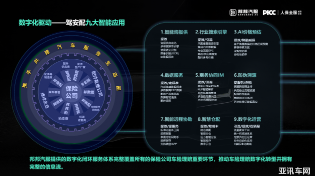 邦邦汽服從保險事故件理賠切入,整合運(yùn)營人保集團(tuán)線上線下優(yōu)勢資源,實(shí)現(xiàn)了以保險為核心的產(chǎn)業(yè)協(xié)同。在保險服務(wù)端,通過打造B2b汽配電商平臺“駕安配”,加快了保險與汽配產(chǎn)業(yè)鏈的數(shù)字化連接與融合。駕安配對接數(shù)據(jù)廠商、建立數(shù)據(jù)標(biāo)準(zhǔn),引入供應(yīng)商數(shù)據(jù)、進(jìn)行精準(zhǔn)報價,開發(fā)及時報價系統(tǒng)和自動匹配系統(tǒng),能夠做到配件品質(zhì)、價格及服務(wù)質(zhì)量透明化、標(biāo)準(zhǔn)化,可評估、可控制。同時,駕安配特有的智能詢、報、供一體化功能,將全球最大的保險定價數(shù)據(jù)庫、配件生產(chǎn)供貨一致性編碼庫和全球最多最全的SKU數(shù)據(jù)庫進(jìn)行有機(jī)統(tǒng)一,不僅在理賠環(huán)節(jié)實(shí)現(xiàn)了科學(xué)降賠、增效、提升服務(wù),更通過增強(qiáng)維修企業(yè)、車主對保險公司的粘性,促進(jìn)車險業(yè)務(wù)增長、業(yè)務(wù)增值、整體服務(wù)水平提升。此外,圍繞保險公司在配件定損時的“換”與“修”,邦邦汽服已先后開發(fā)“邦收配”損余回收平臺及“邦修配”低碳修復(fù)平臺,為相應(yīng)的損余回收商及修復(fù)商提供一套專業(yè)的SAAS系統(tǒng),并使其能夠連接保險公司的相應(yīng)需求,打造面向事故件的閉環(huán)解決方案。