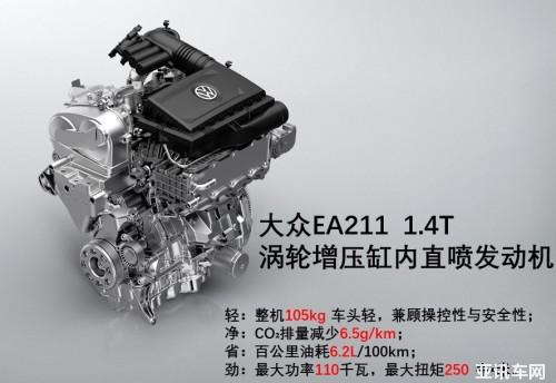 搭載的EA211 1.4T渦輪增壓缸內(nèi)直噴發(fā)動機是大眾最先進的發(fā)動機,輕量化鋁制缸體與先進的VVT進氣技術(shù),讓功率全面提升,能耗降低,1.4T發(fā)動機的動力參數(shù)和很多大眾車型一致,均為最大功率110kW,最大扭矩250N·m。