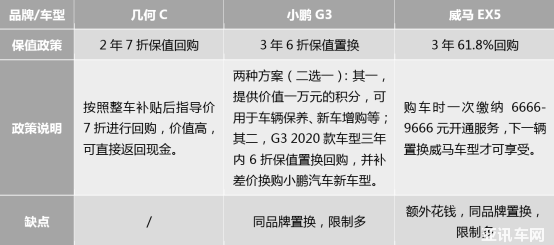 相比之下,小鵬G3推出的是“3年6折保值置換”政策,提供了二選一兩個(gè)方案:方案一是為車主提供價(jià)值10000元的商城積分,可用于車輛保養(yǎng)、新車增購(gòu)等;方案二是車主三年后可將小鵬G3按裸車價(jià)格的60%置換給小鵬汽車,并補(bǔ)差價(jià)購(gòu)買小鵬汽車新車。而威馬EX5的“3年61.8%回購(gòu)”政策,雖然保值率比小鵬G3還高一點(diǎn),但需要額外花費(fèi)6666-9666元開(kāi)通服務(wù)并置換同品牌車型。