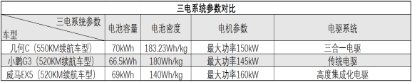 威馬EX5-Z雖說(shuō)在電驅(qū)系統(tǒng)上下了功夫,采用了驅(qū)動(dòng)橋,把電機(jī)、電控、減速器集成到了一起,達(dá)到了節(jié)省空間的目的,同時(shí)傳動(dòng)效率高達(dá)93%,使整車最大功率接近160kW,最大扭矩達(dá)到315N·m,但是其百公里加速最快只有8.3s,相比幾何C 頂配車型7s的百公里加速時(shí)間依然稍欠火候。小鵬G3則沒(méi)有采用“3合1”總成技術(shù),而是將充電機(jī)和電控等高壓用電系統(tǒng)進(jìn)行了“2合1”集成,這種集成形式占用空間相對(duì)較大,整車最大功率也只有145kW,最大扭矩達(dá)300N·m,百公里加速8.6s。