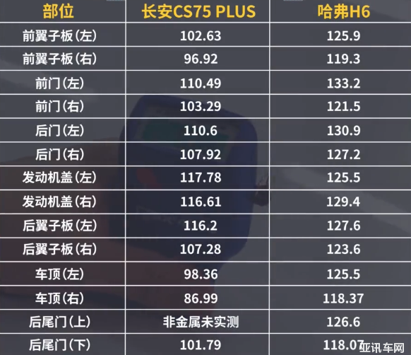 我們先來看看車漆工藝,這部分主要提及了車漆的厚度與防砸能力。前者代表著造車的技術水平,后者則和我們的錢包略略掛鉤,畢竟有幾個坑,算幾個坑的錢。第三代哈弗H6車漆厚度相對均勻,并沒有特別薄的地方,薄厚差距在15微米左右,可見全新長城·檸檬平臺的工藝的確精湛。長安CS75 PLUS明顯就能看出有一些部位車漆過薄,薄厚差距高達29微米,且意外發(fā)現后尾門上蓋整體是塑料質地,不是常用的鋼板,如果被重物砸到很可能會直接裂開。