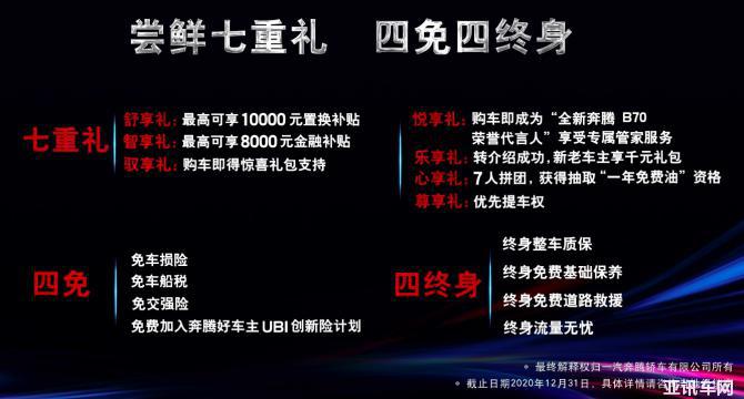 從下圖中不難看出,全新第三代奔騰B70推出的“嘗鮮七重禮,四免四終身”政策,貫穿用戶買車、用車、養(yǎng)車的整個階段。其中,至高10000元置換補貼、至高8000元金融補貼、介紹成功享千元禮包、免車損險、免車船稅、免交強險等幾項政策,就能為用戶至少節(jié)省23000元經(jīng)濟支出,誘惑力滿滿。