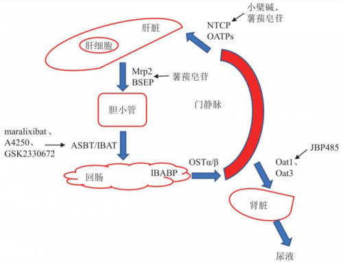 膽汁酸在肝臟、腸道、腎臟中的轉(zhuǎn)運(yùn)途徑(PBC藥物研發(fā)方向根據(jù)作用部位分類)
