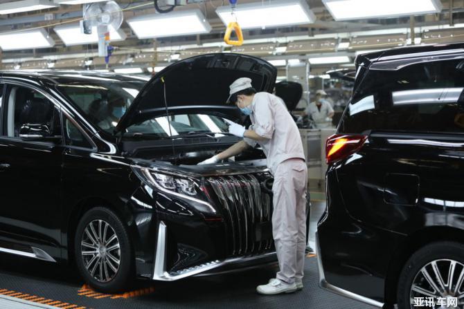 (檢查線上的技術(shù)人員正在對全新傳祺M8各部件進行嚴格檢測)