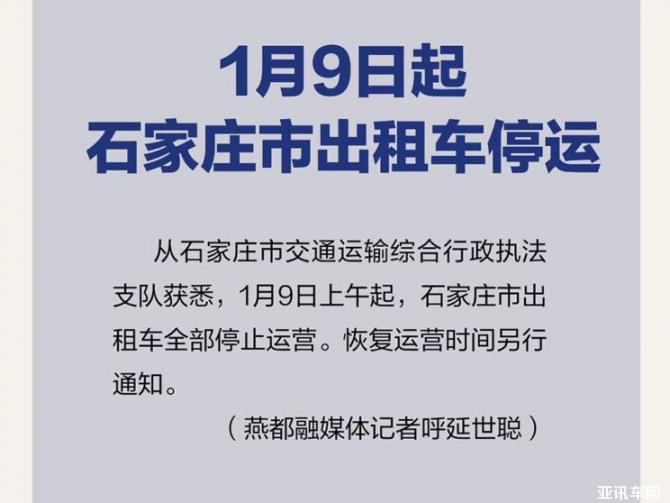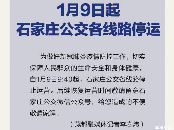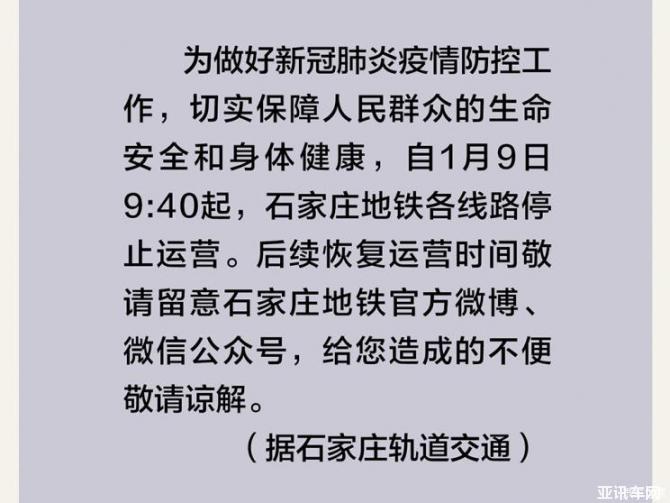 1月9日,石家莊軌道交通發(fā)布消息,為做好新冠肺炎疫情防控工作,保障人民群眾的生命安全和身體健康,自9日9時(shí)40分起,石家莊地鐵各線路、公交線路以及出租車均停止運(yùn)營。后續(xù)恢復(fù)運(yùn)營時(shí)間請(qǐng)留意石家莊地鐵官方微博、微信公眾號(hào)。
